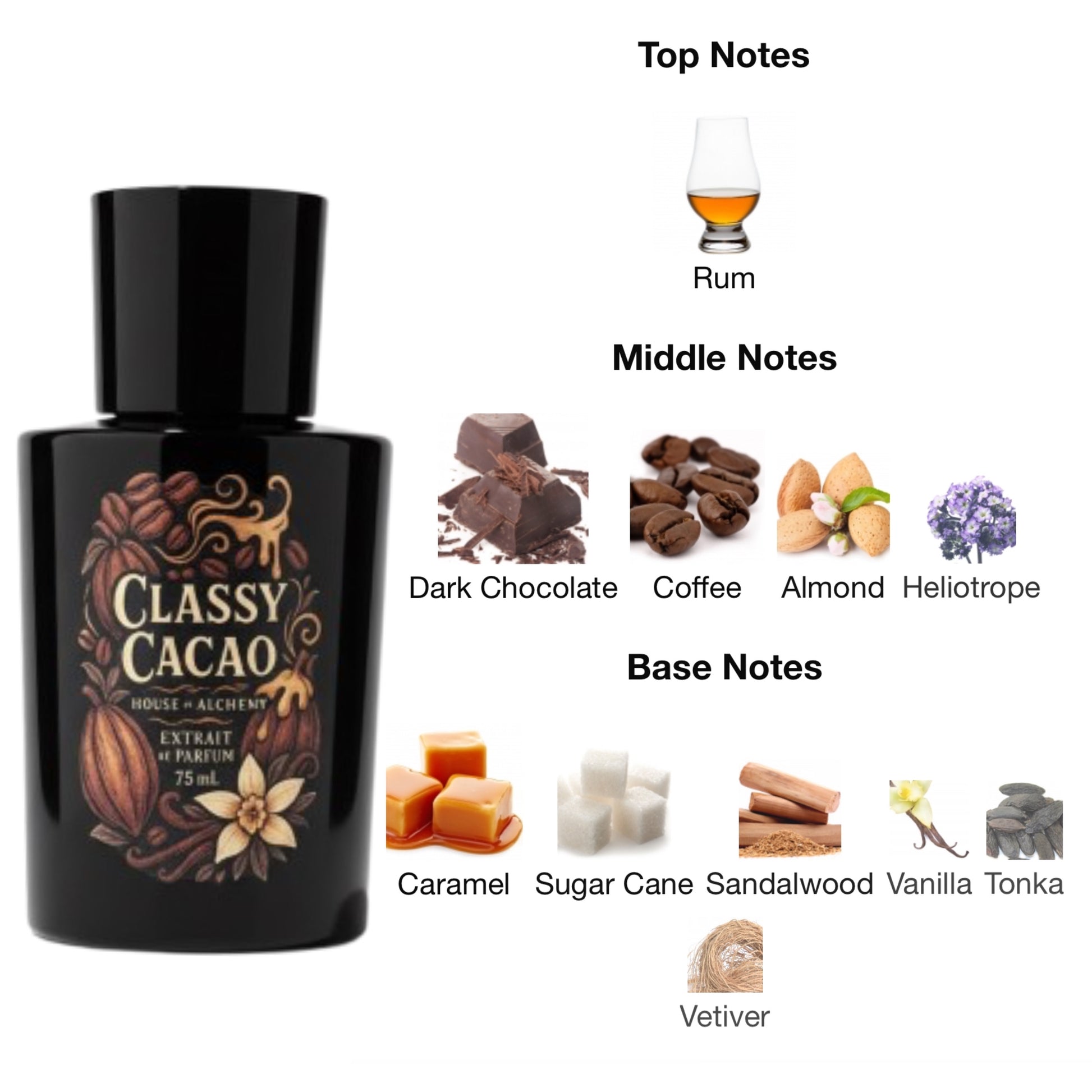 Classy Cacao is a decadent gourmand fantasy, a fragrance that sinks into the skin with dark sweetness and quiet power. It opens with a delicious hit of rum and sugarcane rich, boozy warmth that instantly sets a sensual tone. As it settles, velvety cacao and bitter coffee emerge, creating a deep, roasted aroma that feels both luxurious and dangerously addictive. A whisper of caramel melts through the heart, adding a smooth, indulgent glow.