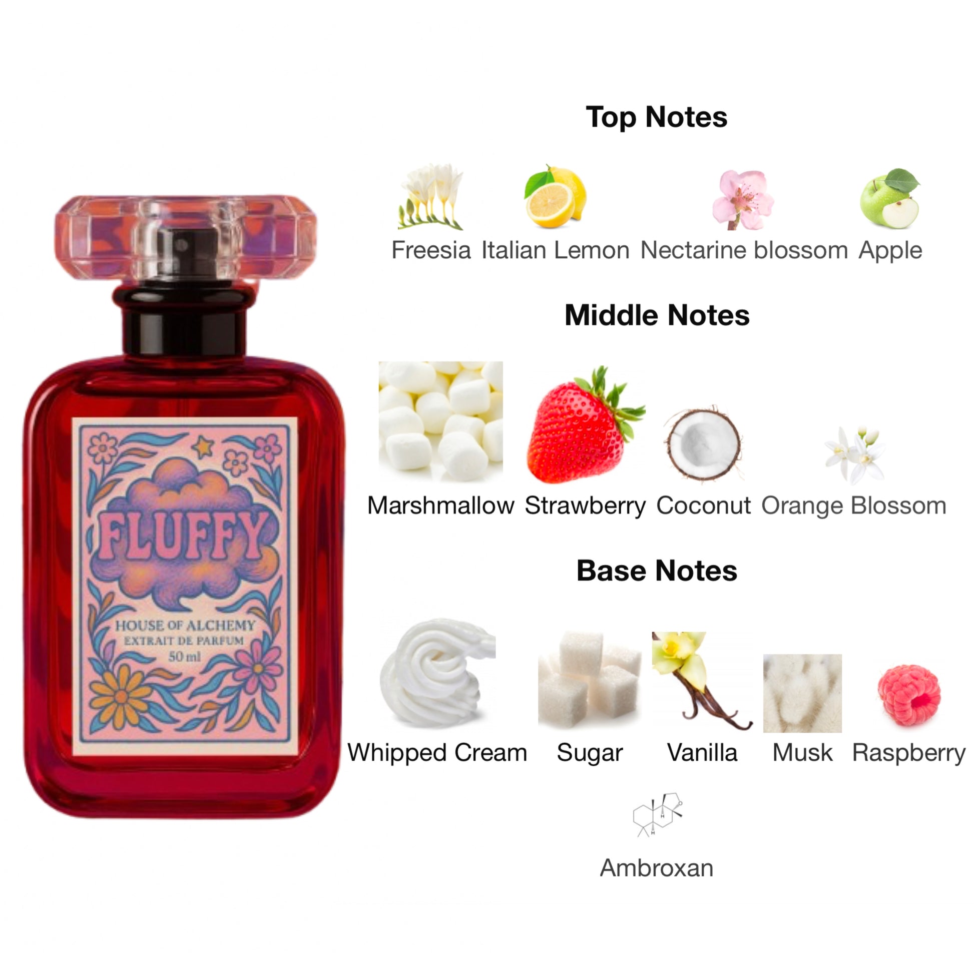 Fluffy is a delicious, cozy gourmand that wraps you in a soft pink cloud. Fluffy marshmallow, juicy strawberry, and whipped vanilla come together in a dreamy swirl, layered with raspberry sugar, pink musk with a musky, creamy dry down. It’s joyfully addictive, sweet but not cloying, playful but wearable.