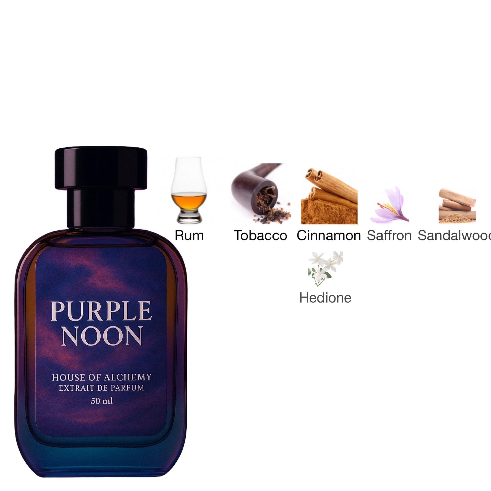 Purple Noon is a captivating, warm fragrance that opens with a blend of rum, cinnamon, and vanilla, creating a sweet and spicy top note. This evolves into tobacco and sandalwood, adding depth and complexity. The base notes of saffron and musk leave a lasting impression.