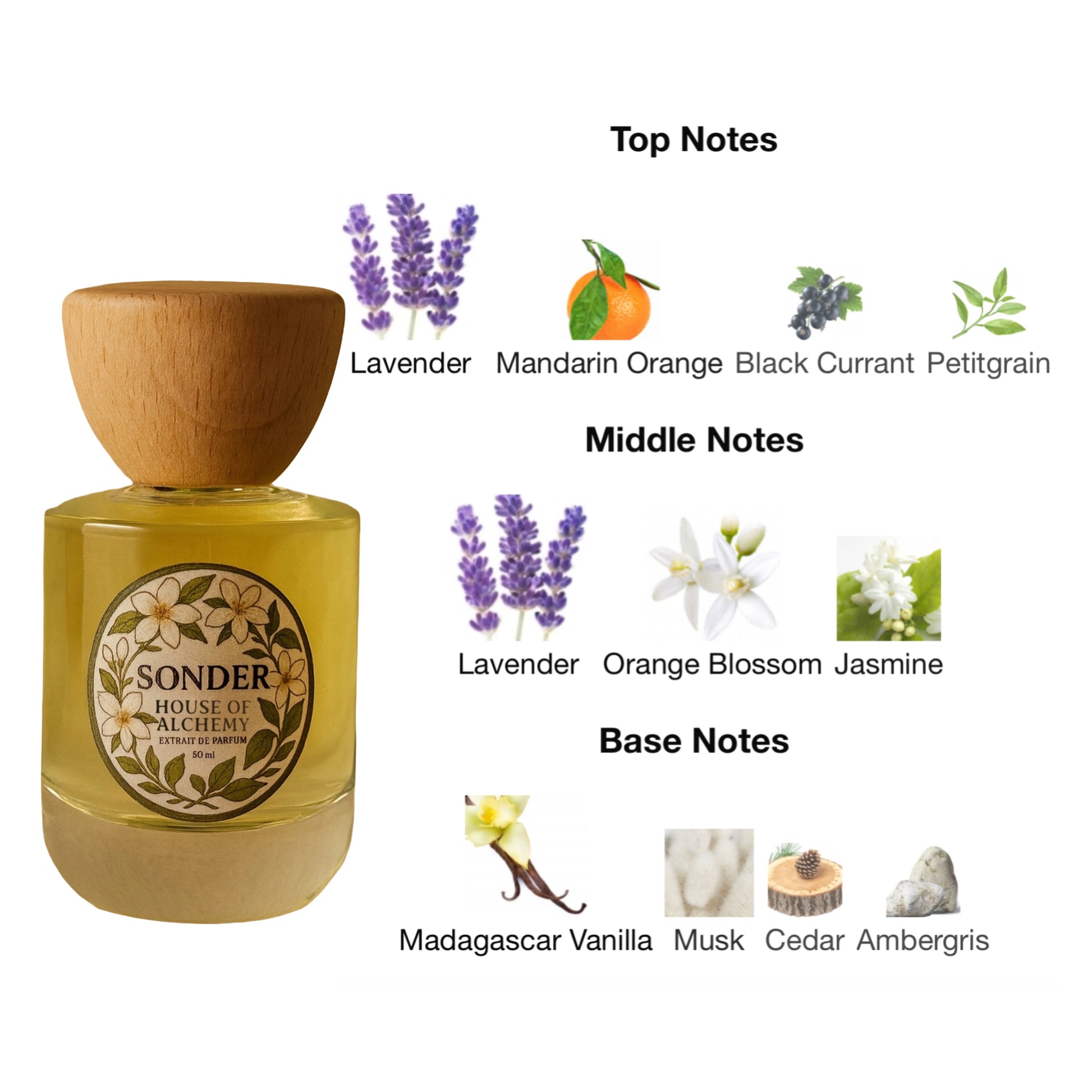 Sonder begins with the brightness of mandarin orange and the crisp, aromatic edge of French lavender, softened by the sweetness of blackcurrant and the green touch of petitgrain. At its heart, luminous orange blossom unfolds with velvety jasmine, while the lavender lingers, binding freshness to floral warmth. As it settles on the skin, creamy Madagascar vanilla blends with cedarwood, musk, and a whisper of ambergris.