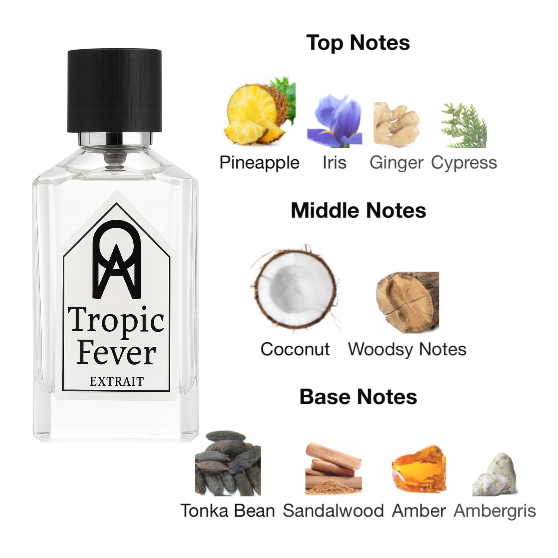 Tropic Fever opens with the electric pulse of pineapple and ginger — sharp, juicy, alive. Beneath that brightness, iris adds a velvet blur, and cypress carves a fresh green spine through the heat.